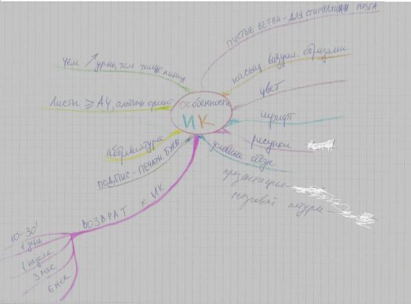 Господи, что же это такое — уже места свободного не остаётся! Весь лист А4 в стрелках-ветках, подписях-надписях. Пестро, ярко, ветвисто, красиво, понятно и… уже есть о чём нарисовать-написать на следующем листе. Так это и есть интеллект-карта?!
