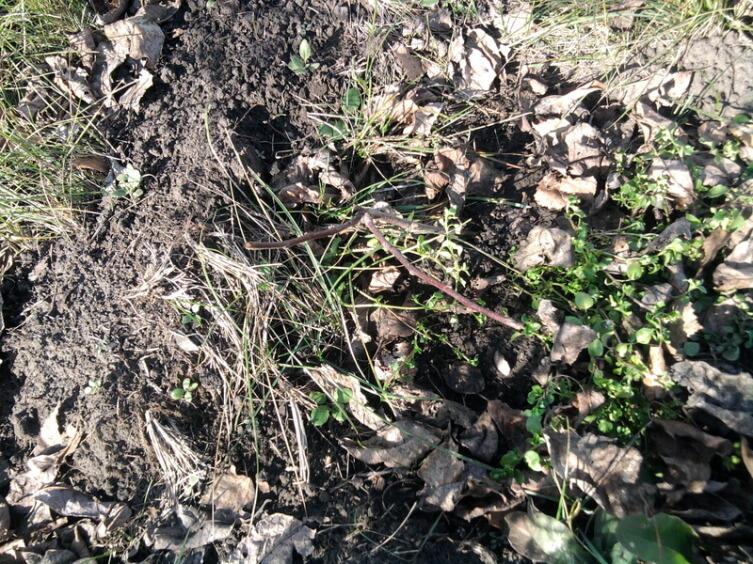 Выбранный побег аккуратно пригибаю, прикапываю в небольшую канавку на глубину 10 см и закрепляю его в этом положении подходящим колышком-рогулькой, сделанным из растущего рядом с садовым участком клена. Со временем он сгниет и не помешает отсаживать молодой саженец яблони на новое место. Прикопку нужно делать так, чтобы над поверхностью земли оставалась ветка длиной 30−40 см. Чтобы случайно впоследствии не повредить саженец, рядом втыкаю металлический загнутый метровый пруток.