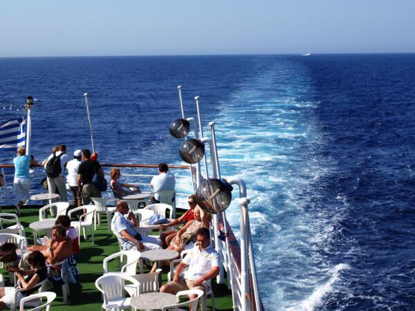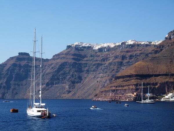 Я добирался как раз морем, но с Крита. Путь занял порядка пяти часов. Стоимость такой экскурсии в местном турбюро, если мне не изменяет память, что-то около 160 евро. В шесть часов утра из порта Ираклион отплывает огромный пассажирский лайнер, и после 5-часового перехода вы уже у обрывистых скал Тиры — главного острова архипелага Санторини.