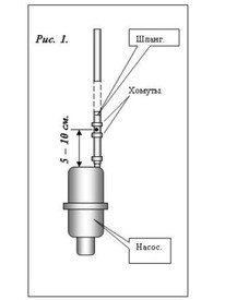 В частности, если вода недалеко от поверхности (3−5 метра) и насос опускается неглубоко, то извлеките насос из скважины и прихватите шланг двумя хомутами в непосредственной близости от насоса (5−10 сантиметров), как показано на рис. 1. Расстояние между хомутами должно быть небольшим — около одного сантиметра. Затем сверлом 4−5 миллиметров просверлите между хомутами отверстие в шланге. Если нет дрели, можно просто проткнуть шланг толстым шилом или гвоздем.