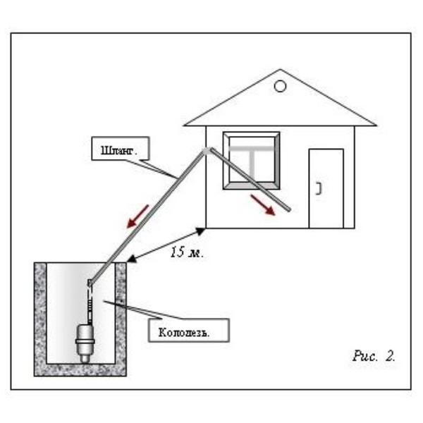 Я применял схему, показанную на рис. 2. Здесь шланг подвязан к тросу (проволока), натянутому между домом и колодцем. (Можно, и даже лучше, применить лоток). У меня расстояние до колодца метров 15. У соседа расстояние было больше, поэтому посередине, между домом и колодцем, он ставил мачту метров пять высотой, чтобы сток воды из шланга (на рисунке показан красными стрелками) был на две стороны.