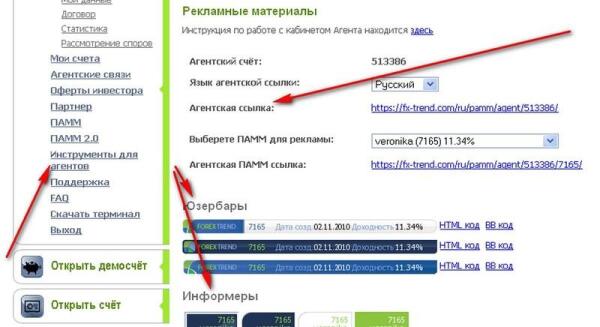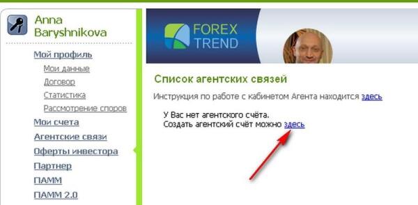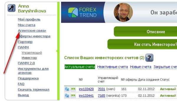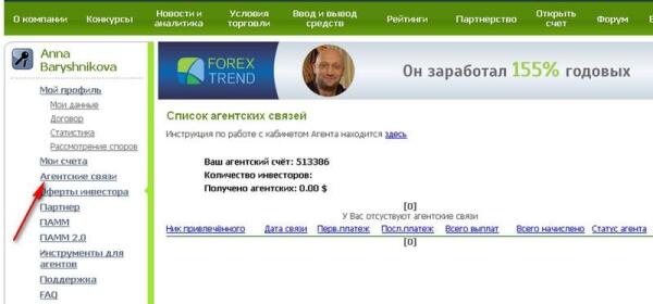 В ожидании итогов очередного торгового периода я обнаружила возможность дополнительного заработка и, поскольку никаких вложений для этого не требуется, решила такой возможностью воспользоваться. Речь идет об агентской системе. Каждый, кто вложил деньги в ПАММ-счета на Forex-Trend, может стать агентом и получать вознаграждение за привлечение новых инвесторов. Помнится, когда я регистрировалась на сайте брокера, в одной из форм было окошко с ником агента. Тогда я не обратила на это внимания, что, в общем-то, не столь существенно, поскольку вознаграждение агенту выплачивается из капитала управляющего, а не из средств инвестора, к тому же, ни с одним из агентов я лично не знакома, поэтому мне все равно, кто получит бонус.