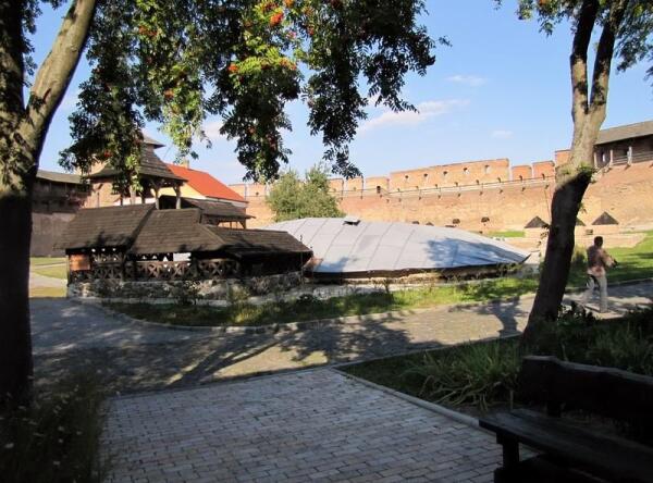 Попасть в него можно через ворота Въездной башни. То, что раньше у замка был не постоянный, а подвесной мост и не один, а два входа — для въезда (ворота) и прохода (калитка), я уже как-то говорил. Поэтому прежде, чем заходить под своды ныне единственных замковых ворот, остановитесь и посмотрите на фасад башни. На нем хорошо видны циркульные проемы замурованных в XVI веке въезда и входа. Да и спешить выходить из самой башни во внутренний замковый дворик тоже не стоит. Внутри неё — две винтовые лестницы, поднимаясь по которым можно посмотреть древние картины и гравюры с видами замка, старинные карты Волыни. А на верхних ярусах — выставку старинных ключей, штофов, бутылей, игрушек. Здесь же, в башне, можно ознакомиться с экспозицией «Оборона замка».