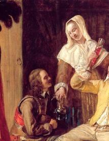 Служанка забирает пустой кувшин, а солдат что-то ей говорит. И взгляд у него вопрошающий, и улыбка двусмысленная. Возможно, он просит принести еще, а служанка так снисходительно отвечает, что, мол, хватит. Или он просит еще чего-то, а она велит ему не торопиться, мол, не сейчас. Хотя, в принципе, она и не против, уж очень он обходителен. Да и внешность у него подходящая: усы, кудри. Во всяком случае, улыбка у нее не сказать — многообещающая, но сочувствующая.