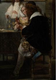 За столом друг против друга — он и она. Похоже, что она — хозяйка. Она в головном платке, который полностью закрывает ее прическу, но в сильно декольтированном платье: грудь поднята настолько, кажется, вот-вот вывалится. (Декольтированное платье — совершенно не в стиле Питера де Хоха, на его полотнах женщины, если можно так выразиться, «тщательно упакованы».)