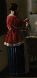 Причем эта рюмка «белого» гостя, который ждет своей порции вина. Он успеет выпить, выкурить трубку и еще кое-что (может быть), пока голубки воркуют. Для этого он внимательно присматривается к служанке, которая наливает ему бокал (вероятно, содержимое его кошелька не позволяет ему засматриваться на хозяйку).