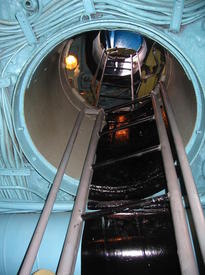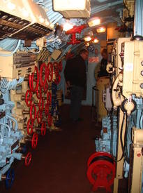Это — носовой торпедный отсек. 533 мм самоходные самонаводящиеся торпеды — главное оружие Б-440. И если сказать — грозное оружие, то никакого преувеличения или ложного пафоса, поверьте мне, не будет. Каждая из 8-метровых торпед весит 2 тонны, из которых 300 кг (15% всего веса!) приходится на боевой заряд. Для того чтобы каждая из торпед смогла при необходимости найти свою цель, в первом отсеке установлено шесть торпедных аппаратов и всё к ним прилагающееся: приборы управления как собственно торпедной стрельбой, так и носовыми горизонтальными рулями, устройство для погрузки торпед и стеллажи для их хранения.