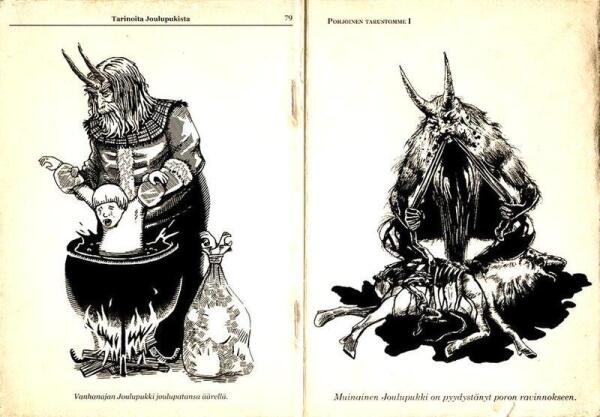 Во время йоля скандинавы наряжались козлами и обходили дома. Послушным детям они дарили подарки, а непослушных — пугали. Поэтому рогатый «предок» Йоулупукки поначалу исполнял ещё и роль нашего Бабая. Потом он подобрел и от козлиных черт избавился.