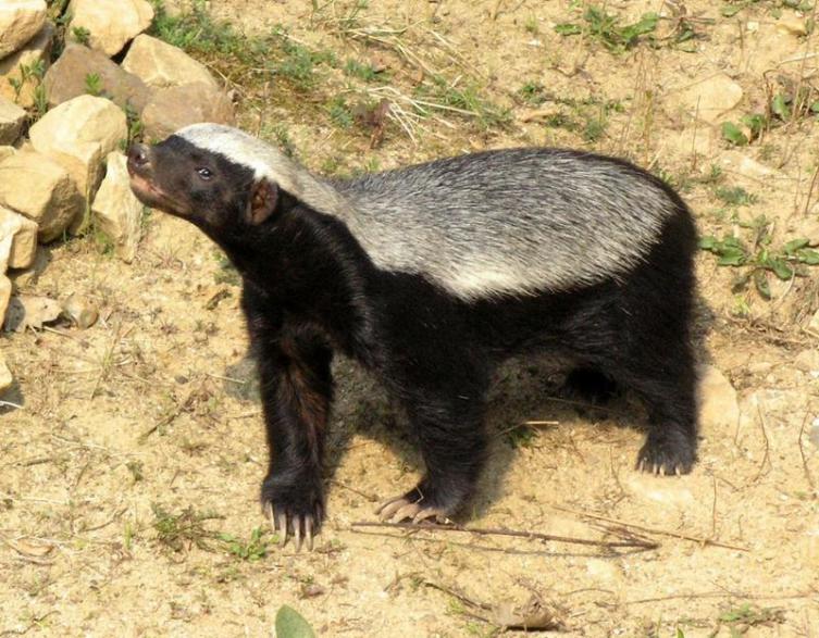 Вот кого действительно не стоит раздражать, так это медоеда. Хотя этот обитатель открытых просторов Африки и Азии вовсе невелик (тело — 75 см, вес — 10 кг), у него крепкое тело, острые зубы, короткие когтистые лапы и «безбашенный» свирепый нрав. Спутать его с другими куньими весьма сложно — сверху медоед окрашен в белый, а снизу — в чёрный цвет.