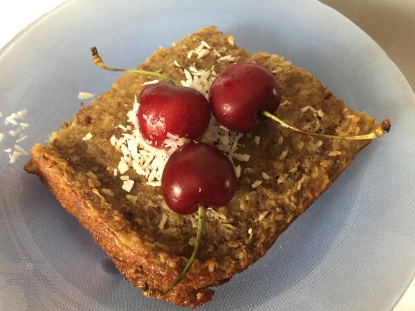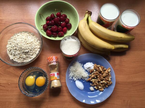 Для приготовления овсяного пирога с бананами нам потребуется: 4 банана, 0,5 чайной ложки молотого имбиря, 2 стакана овсяных хлопьев, 2 стакана молока, экстракт ванили, 0,5 чайной ложки соли, 0,5 чайной ложки соды, кокосовая стружка — 2 столовые ложки, 2 яйца, ягоды для украшения.