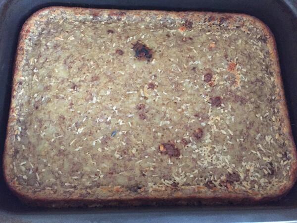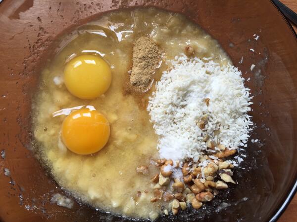 Для начала намоем и очистим бананы, разломаем их в миску и раздавим вилкой, добавим сахар, имбирь и взобьём. Затем добавляем, соль, соду, яйца, молоко, мелко порезанные орехи и кокосовую стружку. Помещаем тесто в смазанный растительным маслом противень, накрываем фольгой и отправляем в духовку при температуре 180 градусов на 30 мин. Через 30 минут снимем фольгу и печём ещё 15 минут.