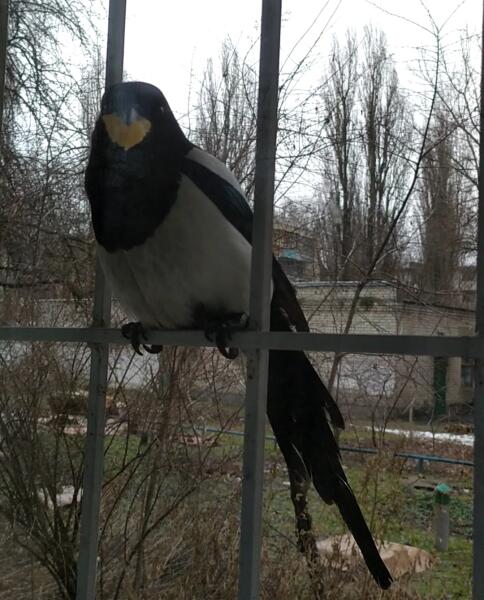 Замечу, что у сороки на фото хвостовое оперение неважное. Возможно, птица потеряла несколько перьев во время встречи с хищником, потому и попросила помощи у людей. Замечу, что пищу из рук пернатые принимают не у всех подряд, а только у тех, кто им нравится (оценивают движения человека), еще и позволить себя сфотографировать - максимум доверия и уважения. Да, птицы очень умные.