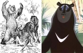 Однако в оригинале у Киплинга ясно написано «…Baloo, the sleepy brown bear…», что Н. Дарузес достаточно точно переводит: «…Балу, ленивый БУРЫЙ медведь». То есть, автор имел в виду не белогрудого, а вполне знакомого нам по народным сказкам солидного бурого Топтыгина. Мотивы создателей мультфильма можно понять — белогрудый медведь встречается в Индии не в пример чаще бурого. Но, как говорится, «написанного пером…».