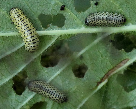 Из благополучно перезимовавших яиц в начале мая, до начала цветения калины, выходят личинки. Мелкие личинки поначалу незаметны, если не присматриваться. Белыми «каплями» они собираются на нижних сторонах молодых листьев и потихоньку их грызут. «Невидимый» период развития продолжается 3−4 недели.