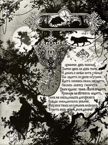 Хотя Пушкин не называет имени этого высокообразованного животного, знатоки фольклора уверены, что под ним подразумевается сказочный кот Баюн (от древнерусского «баяти» — «рассказывать»). Несмотря на, с виду, безобидные таланты, Баюн не менее опасен, чем сладкоголосые гомеровские сирены. Своими «байками» кот буквально «убаюкивает» аудиторию, после чего жестоко расправляется с уснувшими. В сказке «Пойди туда — не знаю куда…» из сборника Афанасьева сообщается, что Баюн «сидит на высоком столбе в двенадцать сажон и многое множество всякого люду насмерть побивает». Герою сказки, чтобы добыть кота, приходится не только бороться со сном, но и использовать множество спецсредств.