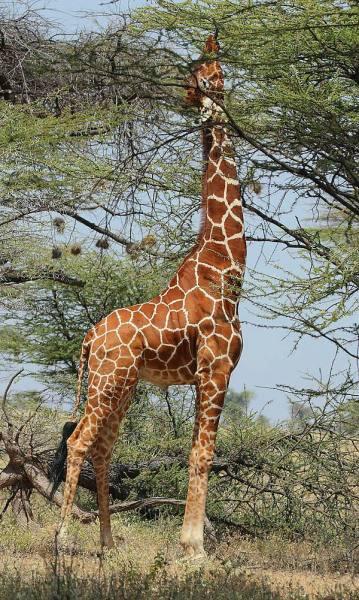 Зачем она нужна — это, конечно, не вопрос. Любой школьник объяснит, что благодаря шее жираф способен добраться до верхних «этажей» деревьев, куда другим копытным путь заказан. Лишние 45 см добавляет тёмно-фиолетовый язык, которым животные не только обрывают листья и подтягивают ветви, но и успешно чистят ноздри.