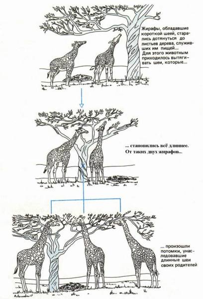 Ламарк ошибался — приобретённые в течение жизни признаки не наследуются (у собак с купированными хвостами щенки всё равно родятся хвостатыми). На самом деле отбор происходит благодаря генетическим преимуществам, которые из поколения в поколение закрепляются. То есть среди предков жирафов стали выживать всё более и более длинношеие особи.