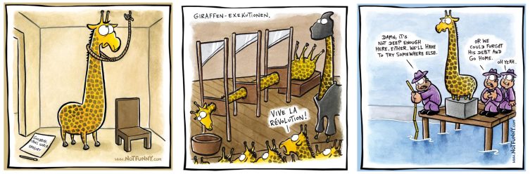 В реальности тоже бывали прямо-таки трагикомические случаи: например, когда жирафы гибли, запутываясь шеей в ветвях деревьев. Но главная проблема связана с тем, что, несмотря на свою длину, шея до земли всё-таки не дотягивается. Чтобы попить, жирафу приходится либо неловко раскорячиться, либо опустится на колени. Вернуться в нормальное положение животное быстро не может, поэтому на водопое становится особенно уязвимым для хищников (в том числе для крокодилов, всегда готовых вцепиться в морду). По этой причине пьют и едят траву жирафы редко — когда уж совсем припечёт.