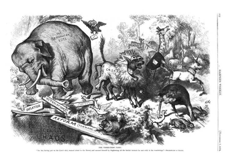 Главным же человеком, который ввёл образы осла и слона в обиход американской политики, заслуженно считается карикатурист Томас Наст — тот самый, что придумал и классического Санта Клауса. Наст был убеждённым сторонником Республиканской партии и особенно сильно помогал своим острым пером знаменитому генералу Улиссу Гранту. Грант дважды избирался президентом США, но стоило ему заикнуться о третьем сроке, как демократы подняли настоящую бучу, обвиняя генерала в «цезаризме» и диктаторских замашках. Кроме того, внутри самих республиканцев начались внутренние дрязги, и кандидатуру Гранта даже не приняли на рассмотрение. На всё это в 1874 году Наст откликнулся карикатурой «Паника третьего срока».