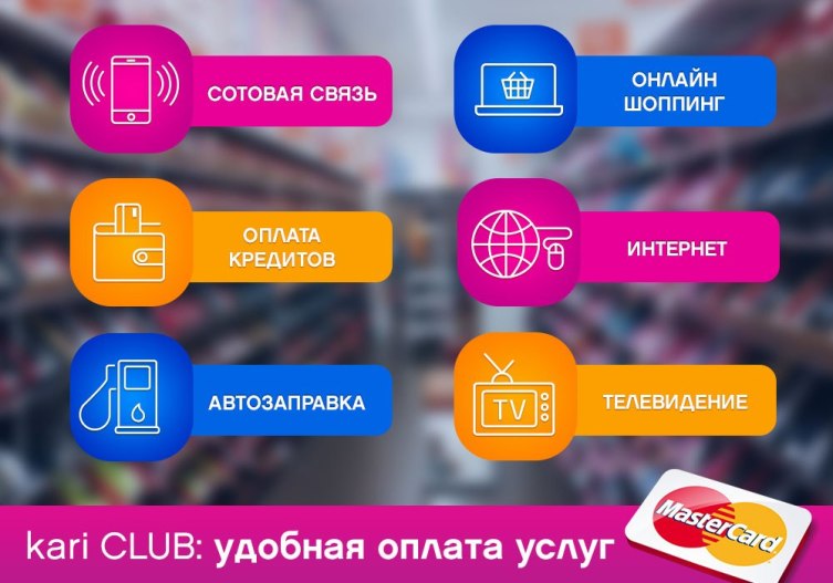 Для удобства своих клиентов компания предоставляет возможность пользоваться многофункциональной платежной картой kari CLUB, которая выводит понятие «комфортный шопинг» на новый уровень.