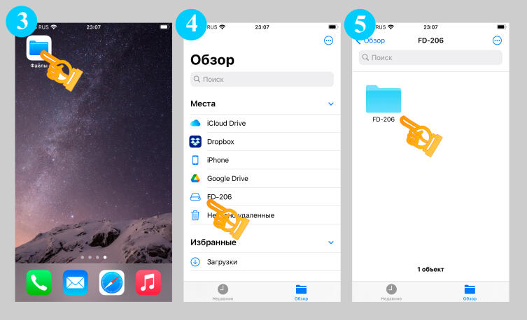 Шаг 4. Во вкладке «Обзор» программы «Файлы» ждем появления папки регистратора с видеофайлами. В рассматриваемом примере это папка FD-206. Касаемся пальцем иконки этой папки.