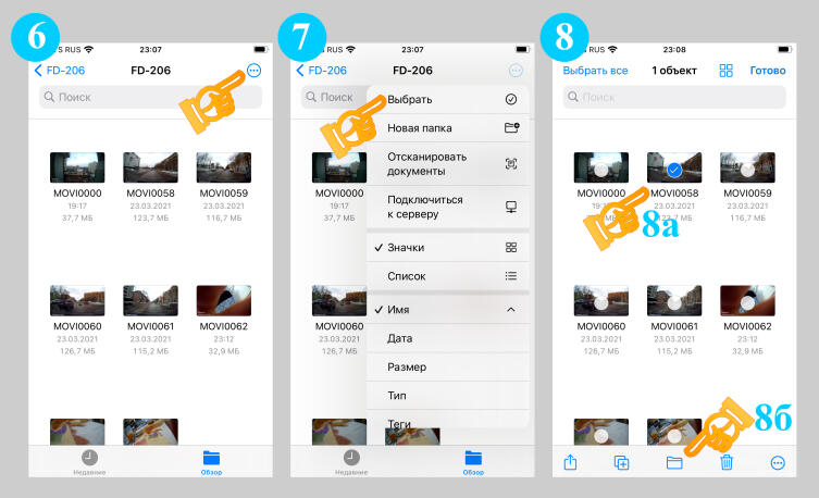 Шаг 8. Программа снова возвращает нас к содержимому папки FD-206, где касанием выбираем нужный для переноса видеофайл и далее касаемся значка «Перенести» в нижней строке меню.