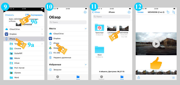 Шаг 11. Во вкладке «iPhone» (в корневом каталоге или намеченной для хранения видео иной папки) убеждаемся в наличии перенесенного видео. Касаемся его пальцем и…