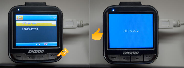 Шаг 2. Дожидаемся появления на экране регистратора сообщения об успешном его подключении по каналу USB. На моем регистраторе этому предваряет диалог для выбора действия: