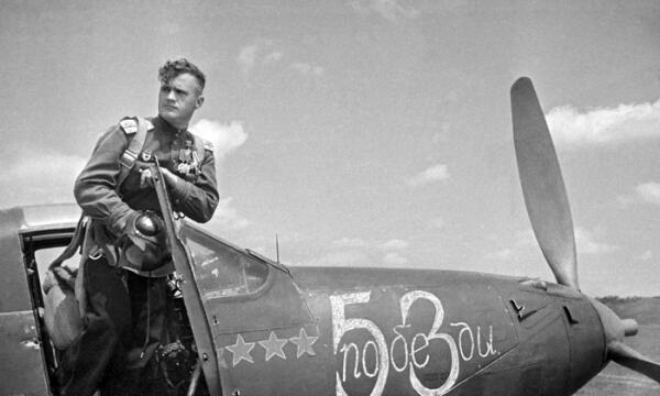 «25.05.1944 г. группа ведёт бой против 25 FW-190, сбивает 11, возвращается без потерь. А показательный бой над Западной Украиной, когда его шестёрка атаковала 35 вражеских самолётов! За 4 минуты боя сбивает 11, остальных рассеивает, 5 целей уничтожает сам командир».