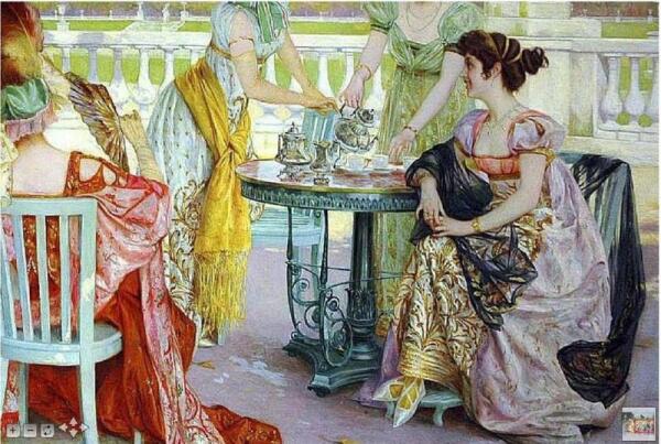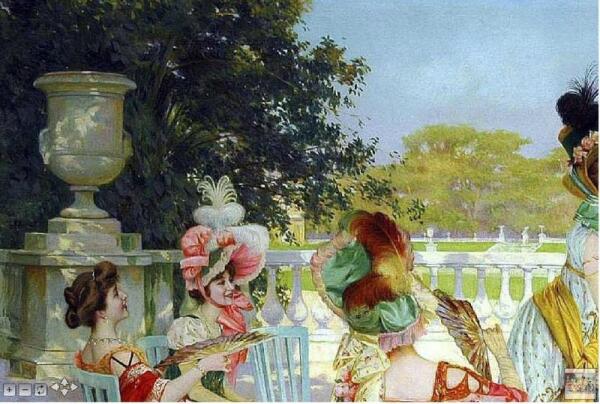 «Послеобеденное чаепитие». Конец лета, листва на деревьях отдает золотом, но жизнь прекрасна! Очаровательные дамы собрались на террасе, сейчас будут пить чай. Как они милы! Какие у них шляпки и прически! А какие платья!