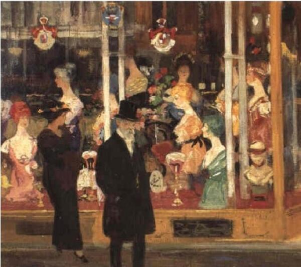 «У витрины». Витрина с дамским товаром. Что именно продают — не очень понятно. Старичок лицом к зрителю, молодая женщина лицом к витрине. Как бы нет прямой связи между персонажами, но кажется, что это — любовники. И ей бы что-то хотелось, но старичок непреклонен, его поза так и кричит: «Не допросишься!»