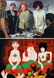 Долго мучались с типажами разбойников. Пока кто-то не принёс календарь с фотографией знаменитой троицы — Трус (Вицин), Балбес (Никулин) и Бывалый (Моргунов). Так разбойники обрели узнаваемые черты «кунаков» из комедии Гайдая «Кавказская пленница».