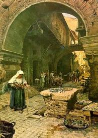 Слева перед аркой на стуле — человек в колпаке беседует с двумя женщинами. Похоже, что у него есть какой-то товар (слева на столике), они прицениваются. Напротив — прислоненная к стене лестница.