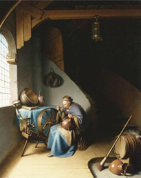 Что привлекло художника в такой сцене — остаётся загадкой. Скорее всего — благородная нищета. Ещё сохранилась накидка с меховой оторочкой, но стульев или даже табуреток в доме нет. И блеск котла — свидетель отсутствия продуктов. И пустая сумка на стене — доказательство бедности. Только прялка даёт какие-то деньги, которых хватает лишь на овсянку и торфяные брикеты.