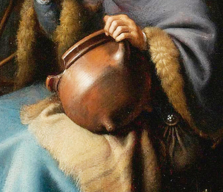 Старушка ест кашу из горшка. Скорее всего, горшок стоял на открытом огне: на коленях старушки тряпка, чтобы не испачкать платье. Судя по наклону горшка, каши ещё очень много.