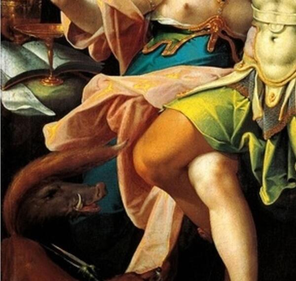 Цирцея уже поняла, что ей не удастся превратить Улисса в свинью, и она быстренько меняет свое поведение. По ее лицу видно, что она собирается соблазнить воина. А Улисс еще насторожен, он не очень верит в то, что все самое худшее позади (свидетельство самого худшего — голова свиньи в левом нижнем углу).