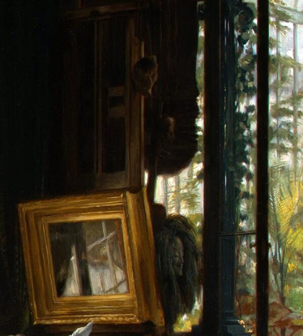 «Игра в прятки». Салон богатого дома: высоченные потолки, ковры, кожаные кресла, зеркало в массивной золоченой раме, роскошная настольная лампа с основанием из расписанного фаянса (судя по тигровым шкурам и маскам, хозяин дома бывал в Африке, может быть, неоднократно и успешно там охотился). Молодая женщина с газетой сидит в кресле спиной к окну, за которым виден сад с экзотическими растениями.