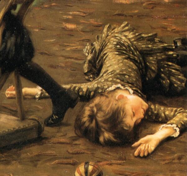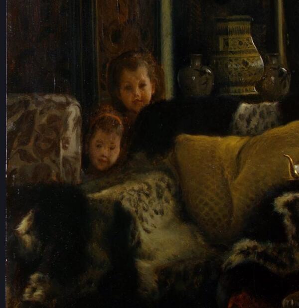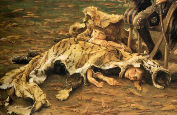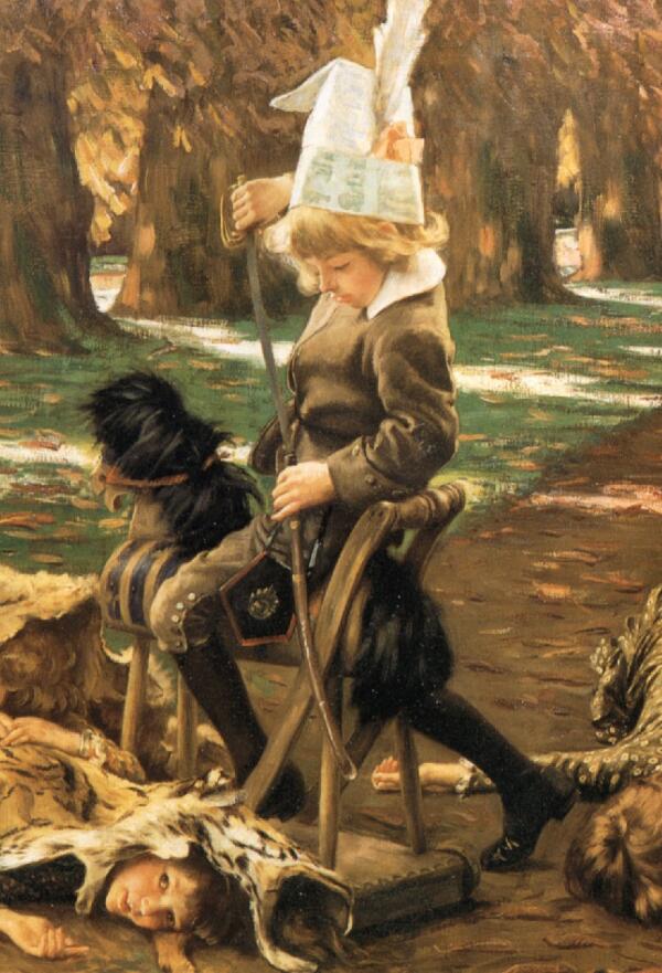 «Молодой охотник». Дети в старом парке (в конце аллеи видно здание). Они играют в охоту. Охотник на коне уже убил двух тигров и вкладывает саблю в ножны. Справа от него — главная героиня, которую охотник спасал от тигров (непонятно, спас или нет, но она улыбается).