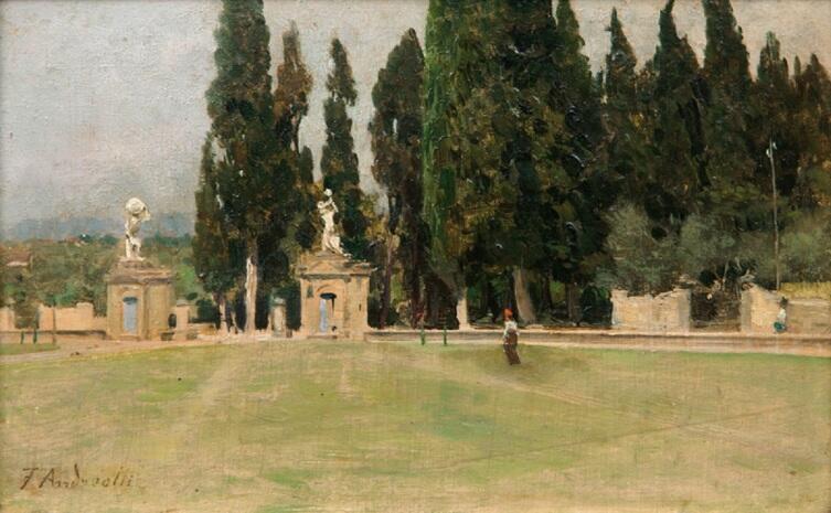 Среди его полотен есть очень небольшая по размеру картинка «Площадка на вилле Императорская горка» (на вилле располагается школа для девочек — детей из семейств аристократов). Можно предположить, что именно посещение этого места каким-то образом направило взгляд и кисть художника в область беззаботных, легких отношений между молодыми людьми, в область скорее романтическую, оторванную от действительности, чем обремененную какими бы то ни было обстоятельствами и обязательствами.