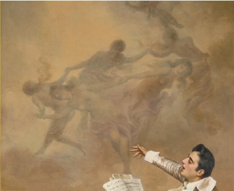 «Концерт». Роскошная комната, видимо, в каком-нибудь богатом замке: фрески до потолка с мифологическими сюжетами, большой инструмент, отделанный золотом, позолоченная ваза слева у позолоченной ширмы. Умопомрачительные платья: девушки готовились к приходу музыканта. А сейчас они наслаждаются игрой и пением гостя.