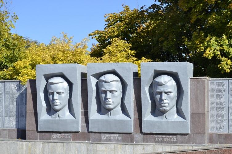 Мемориальные доски и имена, имена, имена — более тысячи имен… Во время войны на этих высотах шли жесточайшие бои. Территория переходила из рук в руки. Командовал стрелковой дивизией Николай Филиппович Батюк. Дивизия прошла длинный путь, они воевали на Брянском фронте, затем Сталинград, бои в районе Мамаева кургана, а в июле 43 г. — бои за Славяногорск.