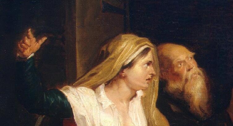 Аврам сохраняет спокойствие, смотрит, чем все это кончится. Агарь пытается утихомирить разбушевавшуюся хозяйку — об этом говорит ее правая рука. И вся ее поза: «Да я сейчас уйду!»
