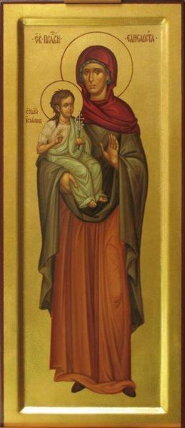Встречается и еще один сюжет, изображающий женщину с ребенком: св. Елизавета и Иоанн Креститель. Отличить его от ребенка-Иисуса можно по атрибуту: в руках Иоанна видим крест, отрубленную голову, иногда — чашу с лежащим в ней Христом, чаще ребенком; свиток с пророчествами о пришествии Христа.