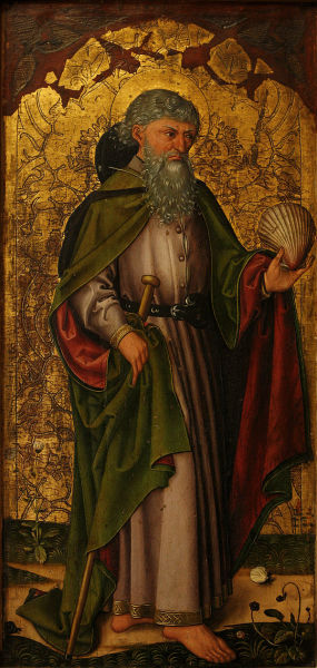 Символическими оказываются и атрибуты апостола Иакова: морская раковина-гребенка и посох, символизирующие паломничество к мощам апостола (и возможно, его собственный путь) через всю Европу, к северному побережью Испании. Откуда паломники и привозили те самые раковины-«сувениры» в знак того, что они дошли до конечного пункта маршрута.