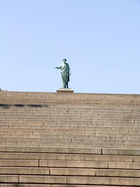 Сейчас, когда внизу подняли уровень набережной, восьми нижних ступеней не видно. Лестница поднимается на 27 метров, а её длина 142 метра. Кто еще не забыл тригонометрию, может оценить крутизну подъема: 11 градусов. Ненапряжный уклон. А если еще учесть, что на длинных площадках между маршами можно перевести дух, подъём по Потёмкинской лестнице не затруднителен.