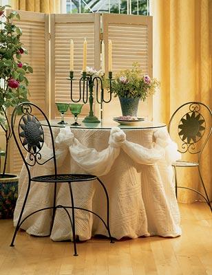 Отутюжьте полуфабрикат будущего шедевра и постелите на стол. Отлично! Теперь начнем украшать. Сделайте ревизию всех своих старых залежей лоскутов или купите несколько метров дешевой ткани. Нужна похожая по цвету или же, наоборот, контрастирующая с основой ткань. Хорошо драпирующаяся. Идеально подходит прозрачный мягкий капрон. Будем его драпировать по краю стола. Сначала прикрепляем булавкой край, делаем небольшую фалду и снова крепим второй булавкой. Должен получиться такой стол как на фото.