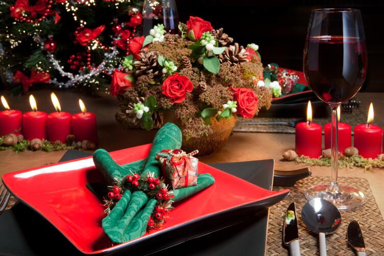 Декорируем стол. Отлично смотрятся в середине стола композиции из еловых веток и шишек, украшенных летами, игрушками и гирляндами. Вот где полёт фантазии! Привлеките к этому действу детей — праздник будет по-настоящему семейным.