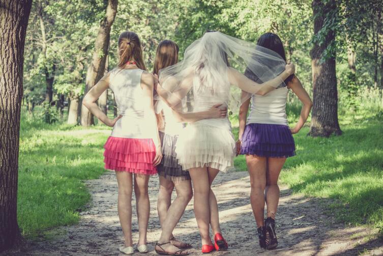 Также тематическое мероприятие диктует определенные образы участниц холостяцкой вечеринки. Ситуацию, когда затруднительно подобрать гардероб девушкам в одном стиле, спасут специальные разнообразные аксессуары — короткая цветная фата, футболки с надписями. Единственное — действует то же негласное правило, что и на самой свадьбе: невеста должна быть в центре внимания.