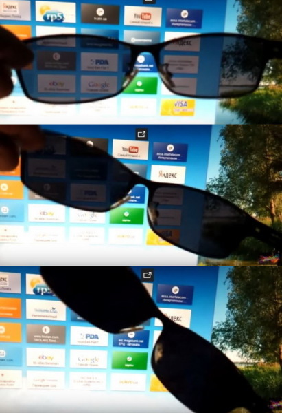 Вот поляроиды, в силу своих физических свойств, не пропускают некоторые отраженные лучи или, как их называют, блики. Для того чтобы проверить, обладают ли очки поляризационным эффектом, достаточно посмотреть через них (даже не надевая) на дисплей большинства телефонов или ПК и слегка повернуть их влево или вправо. Если это поляроиды, то будет явное изменение яркости дисплея.