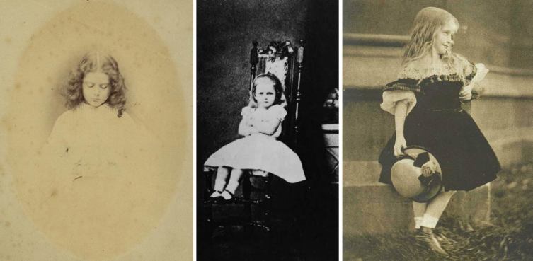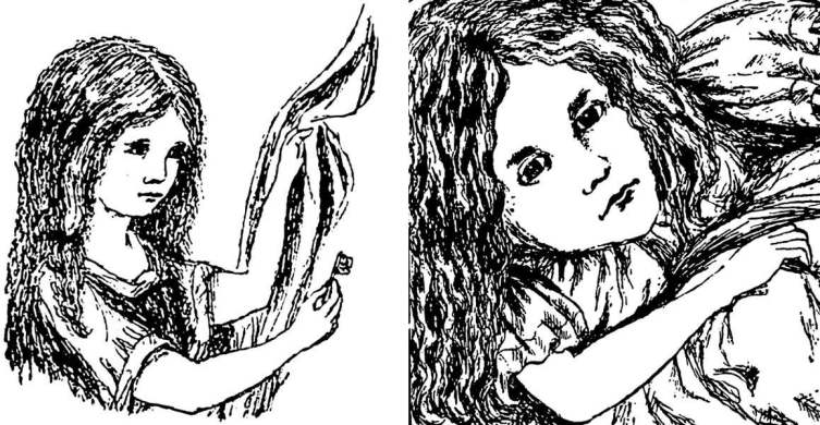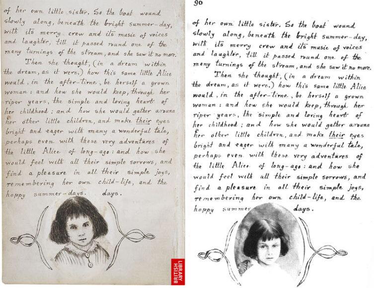 Но даже судя по этому скромному описанию, героиня книги не похожа Алису Лидделл. Достаточно взглянуть на её фото, которое Кэрролл вклеил внизу последней страницы своей рукописи (кстати, сначала на этом месте был рисунок автора, тоже изображающий его маленькую подружку). Мы увидим девочку с серьёзным взглядом, тёмными волосами и причёской в стиле «каре» с чёлкой.